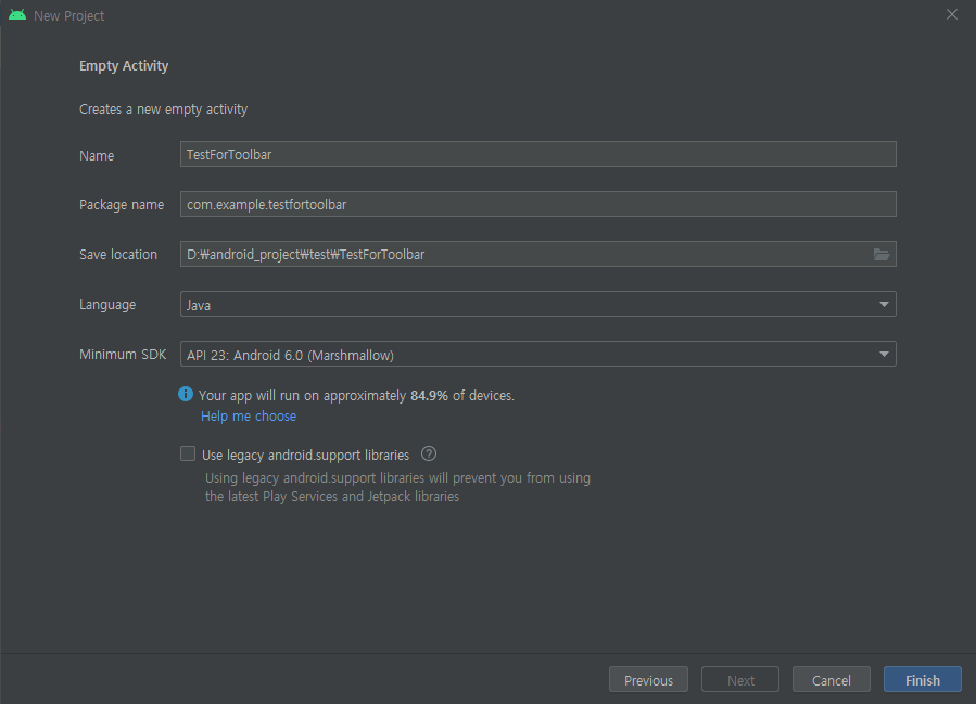 TestForToolbar라는 이름을 가진 프로젝트를 하나 생성하겠습니다.