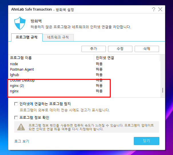 - nginx 를 실행하니 윈도우즈에 ahnlab 팝업이 발생하였고, 추적하여 설정에 도달하니 `방화벽 설정`이라는 뭔가 문제가 될만한 요소인 옵션을 발견하였다.