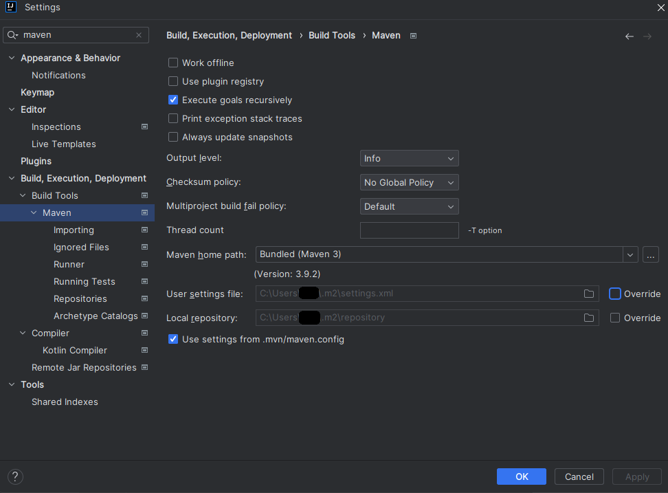 - `User settings file` 설정에서 settings.xml 파일의 경로를 명시하고 있습니다.