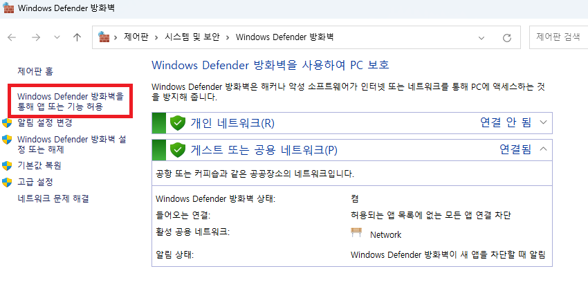 - `windows defender 방호벽을 통해 앱 또는 기능 허용` 메뉴에 접근
