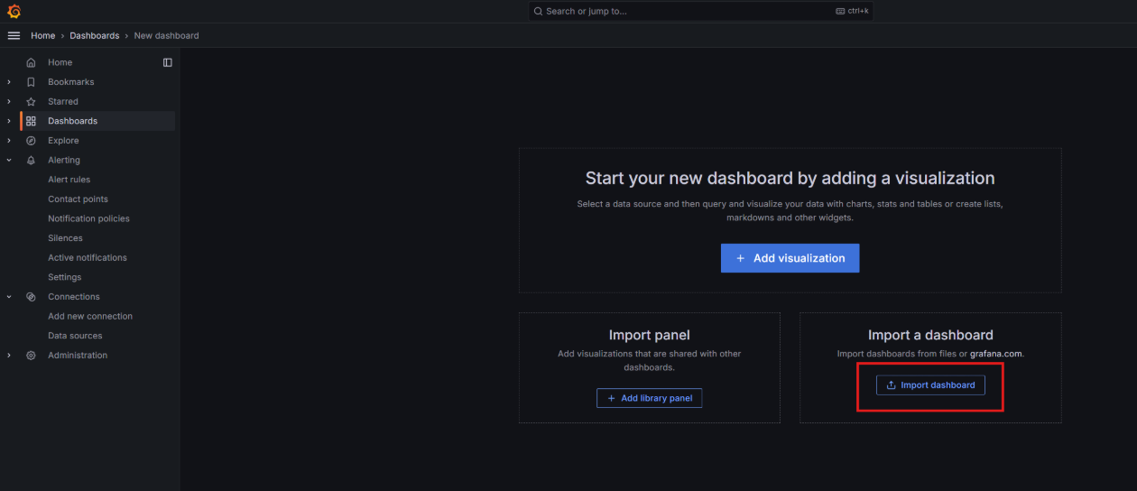 Dashboard 페이지로 이동하여 `Import dashboard` 버튼을 통해 진입합니다.