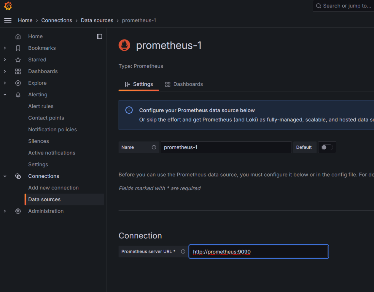 - prometheus:9090 와 같이 IP 가 아닌 도메인 호출방식처럼 사용할 수 있는건 docker compose 의 기능중 하나입니다. docker comopse 로 실행된 각 컨테이너는 그들의 컨테이너명 혹은 서비스명을 통해 각 컨테이너로 접근이 가능합니다. 따라서, grafana 서비스 내에서 prometheus 로 위와 같은 URL 로 접근할 수 있게 되는 것 입니다.