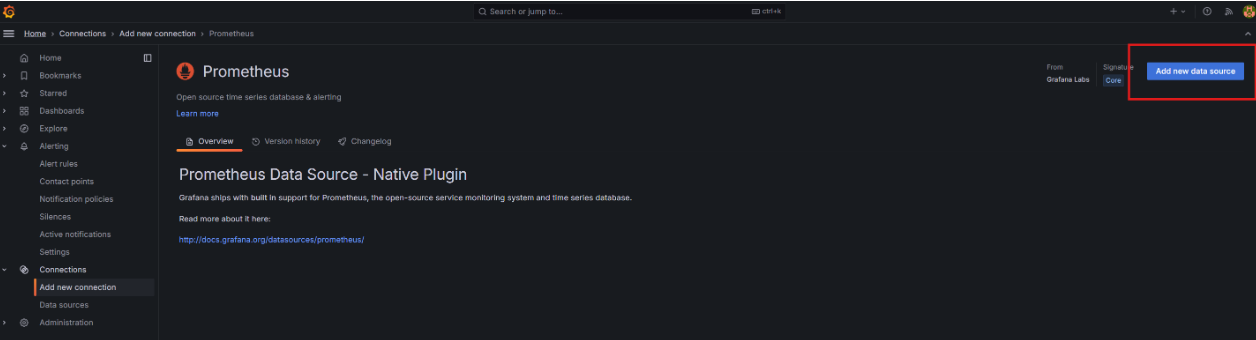 우측 상단의 `Add new data source` 를 통해 datasource 생성 페이지로 진입합니다.