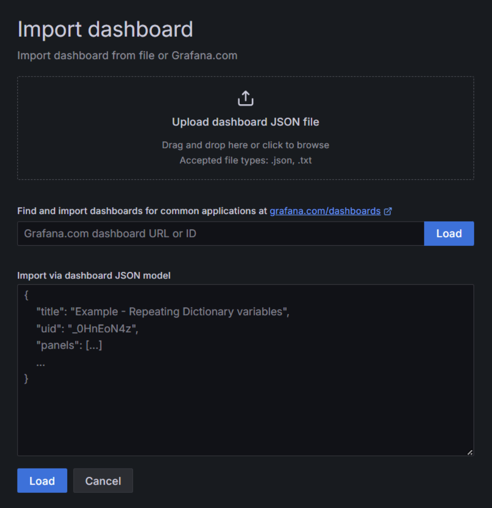 위에서 보는 바와 같이 dashboard 의 특징은 Json 으로 기록되고 저장됩니다. 그리고, Grafana 는 이를 URL 혹은 Json 파일로 Import 를 가능케 합니다. 우리는 linux server 에 대한 모니터링을 할 것 이고 URL 로 진행할 것 임으로임으로 아래 URL 을 입력창에 입력한뒤 `Load` 버튼을 눌러주세요.