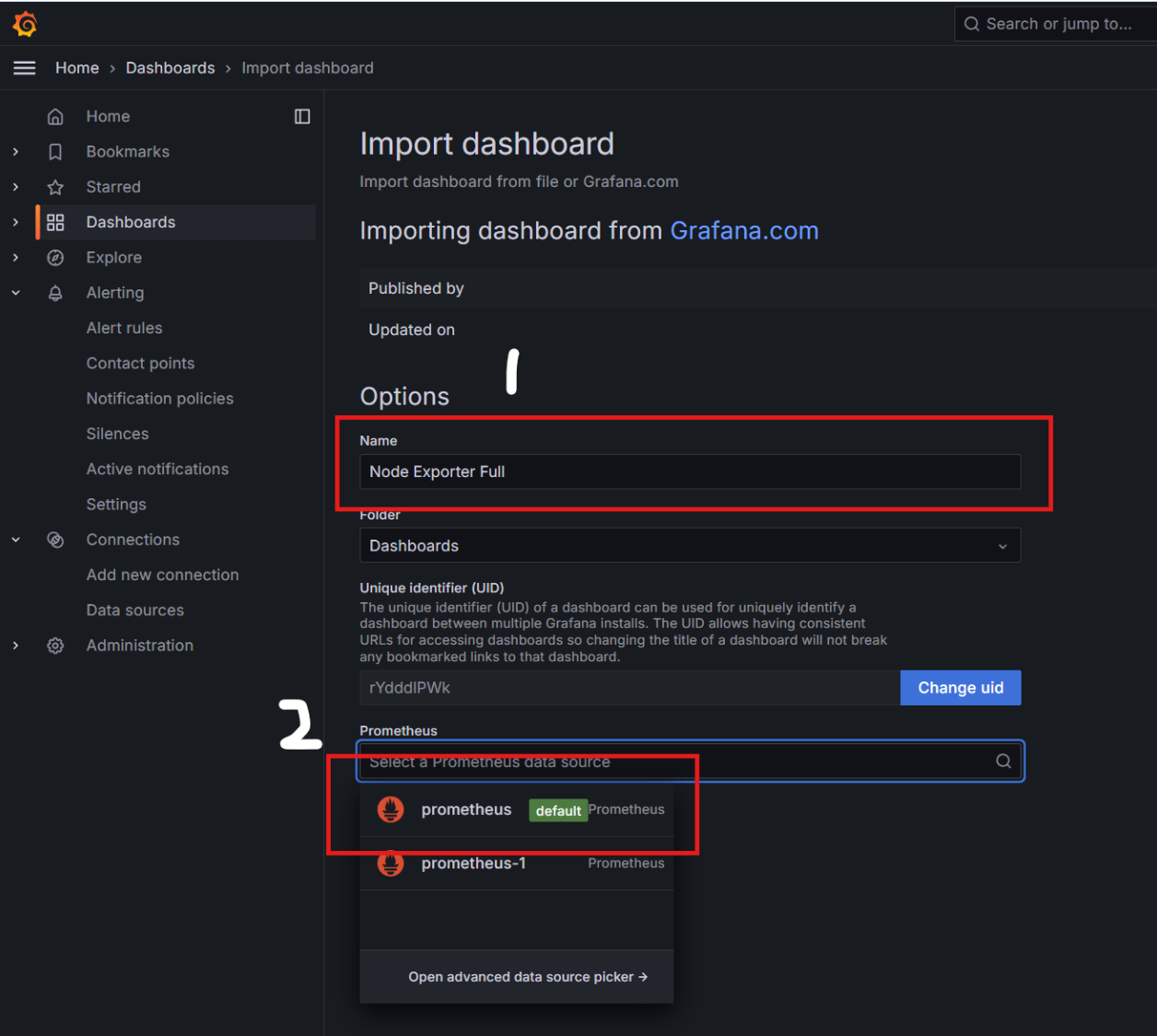 - 아래 Prometheus SelectBox 에서 기존에 추가하였던 Datasource 를 선택해주시면 됩니다.